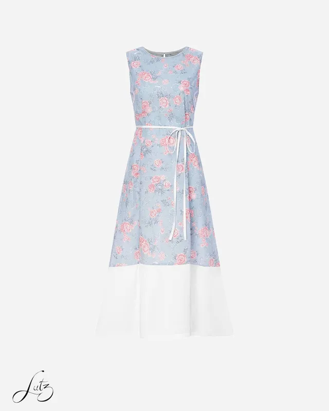 Họa tiết Floral tinh tế: Trên nền vải xanh dương nhạt, những đóa hoa hồng pastel (Floral) được in sắc nét nhưng vẫn giữ được nét mềm mại, tạo nên vẻ đẹp nữ tính, cổ điển.